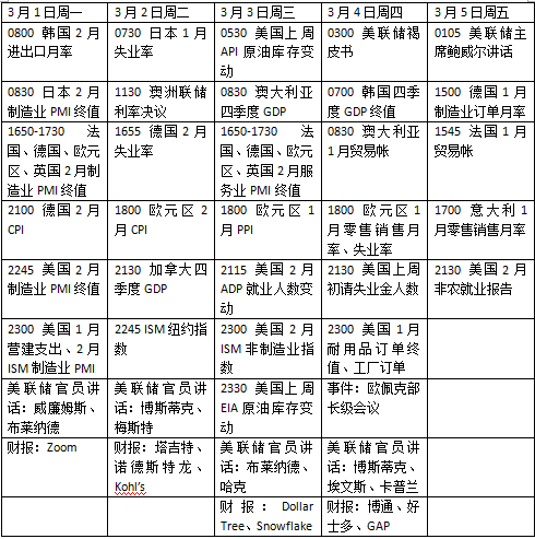 本周看点颇多,石油输出国组织(OPEC)部长级会议将召开,产油国或放宽减产协议;欧美主要经济体将更新2月制造业、服务业PMI数据;美联储公布褐皮书,美联储主席鲍威尔将就经济发表讲话,美国2月非农就业报告则有望延续反弹。